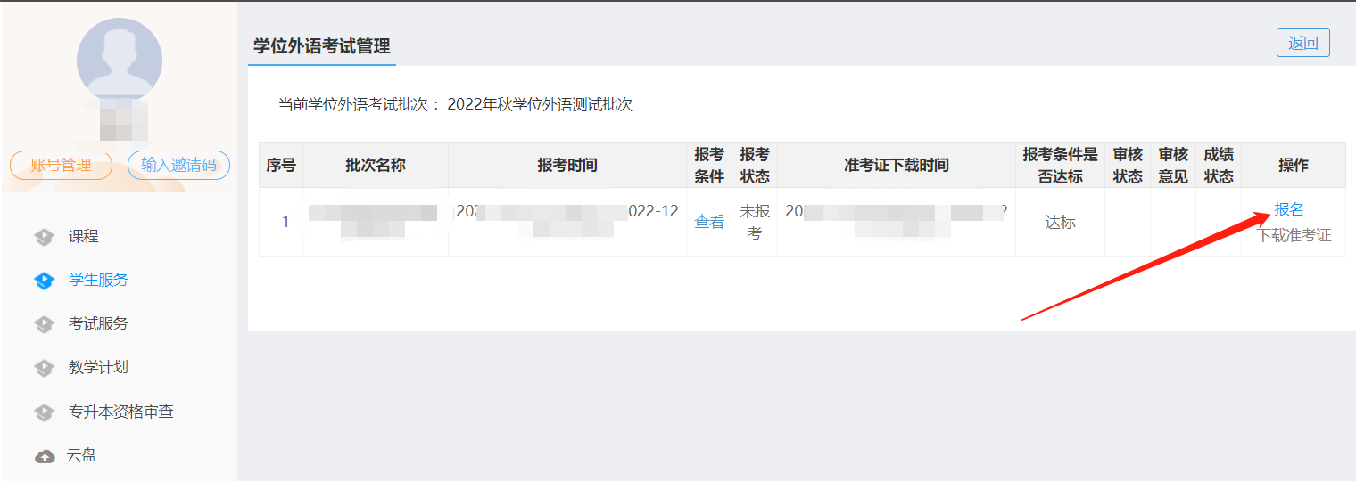 2. 登錄后進入個人中間,點擊學生服務-學位外語考試,進入考試報名信息頁面