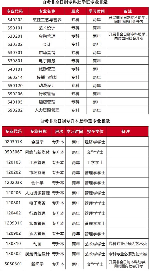 為進一步滿足地方經濟社會發展需求,充分發揮辦學優勢。經報湖北省教育考試院批準,學校設立助學點負責招收高等教育自學考試非全日制專科、專升本助學班學生,并在湖北經濟學院繼續教育學院指導與監督下進行學生日常教學及管理。湖北經濟學院繼續教育學院自考非全日制專科助學班目前開設烹飪工藝與營養、藝術設計、金融管理、會計、市場營銷、電子商務、旅游管理、傳播與策劃、動漫設計、行政管理、酒店管理、人力資源管理等12個專業,自考非全日制專升本助學班目前開設金融學、會計學、市場營銷、人力資源管理、動畫、視覺傳達設計、新聞學等13個專業,熱誠歡迎廣大學生踴躍報讀!